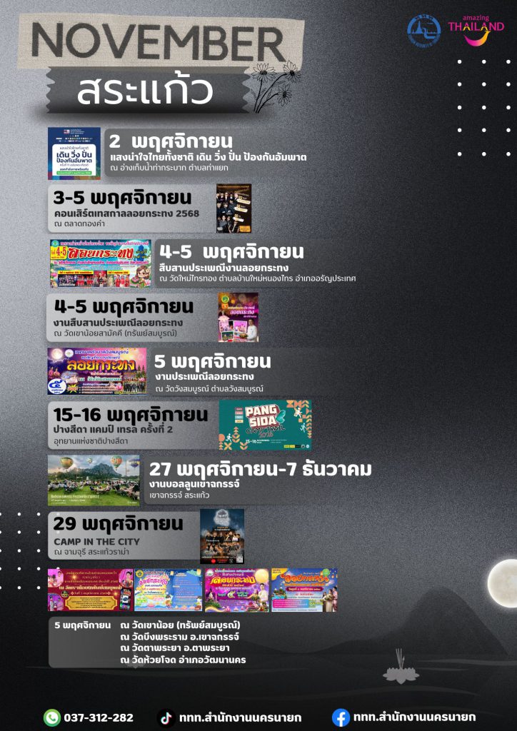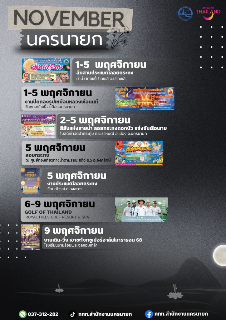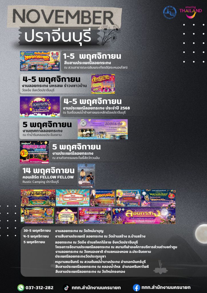 ททท. สำนักงานครนายกประกาศปฏิทินท่องเที่ยวเดือนพฤศจิกายน 2568 ดังนี้